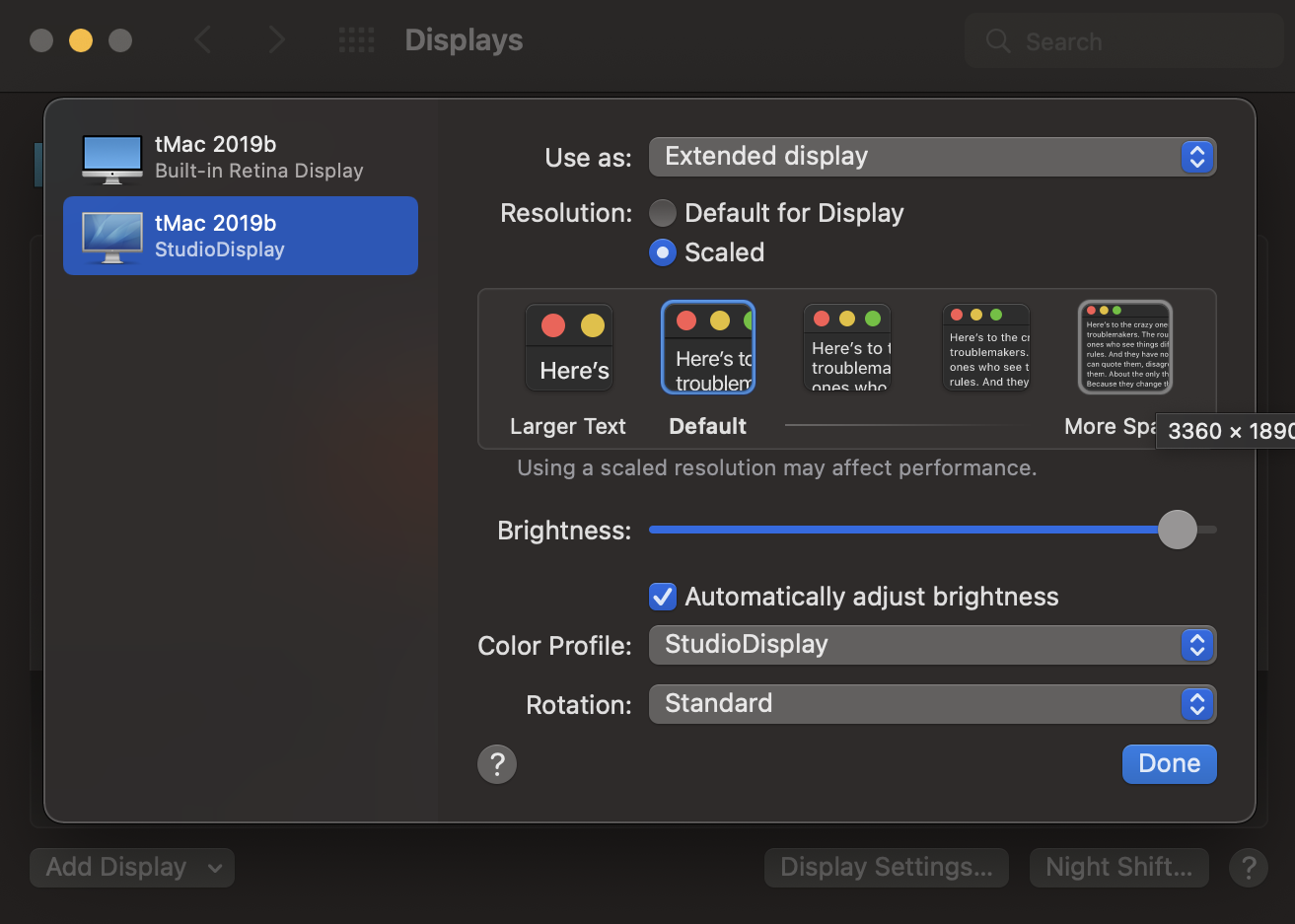 I have experimented with that a little, and what I find does not seem right to me. When I choose scaled, I am not offered choices in resolution. Rather it offers me choices between Larger and Smaller text, which is guess is supposed to be simpler, but I find infantilizing and really annoying. When you hover the mouse over the options resolutions pop up, but the highest one is 3360 x 1890 as shown in the attached image. That number is still a lot smaller than the 5120 x 2880 spec for the display, and when I choose it, it actually seems a lot higher--meaning it makes everything smaller than what I see on my iMac's monitor. None of this makes any sense to me. Why do the display settings not let me chose between actual resolutions, and why is the 5k resolution of the monitor not an option. I have my iMac and my Studio Display side-by-side, and there should be a setting that makes them equivalent in size since they are supposed to be the same resolution displays.
