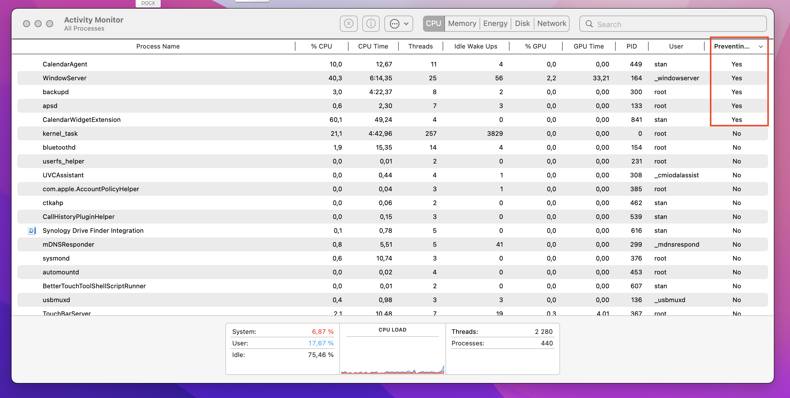 - Activity Monitor toggling "View - Columns - Preventing sleep" shows many different processes which might cause the wake, for example: Calendar Agent, WindowServer, backupd, apsd, CalendarWidgetExtension, AddressBookSourceSync etc (see screenshot attached)