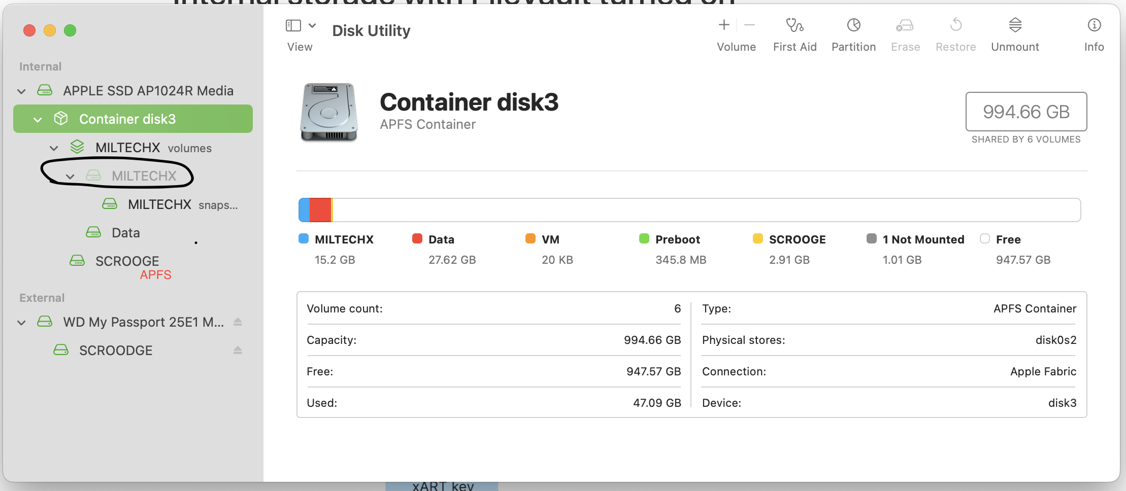 From the image below, Macintosh HD (renamed to MILTECHX) was encrypted with FIle Vault. Next , thanks to an extremely helpful gentleman's explanation, SCROOGE APFS Volume was created.