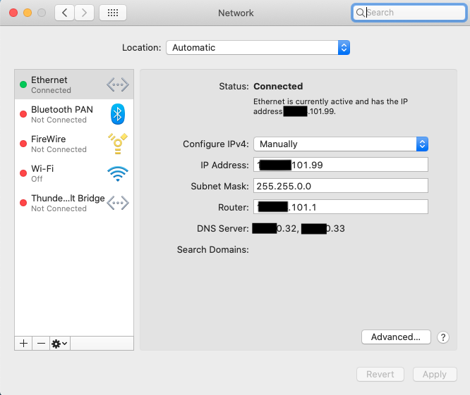 I'm trying to connect to my LAN router. After I plug-in the LAN Cable and manually set my IP, Subnet Mask, Router and DNS Server address, ethernet says it is Connected (Screenshot Below). However; when I try to ping the router through terminal, it says:
