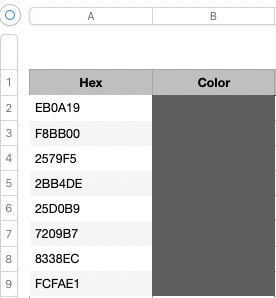 I have a table, where I insert HEX color designation, and manually change to fill of a cell in a second row to said HEX color. Is there a way to do it automatically?