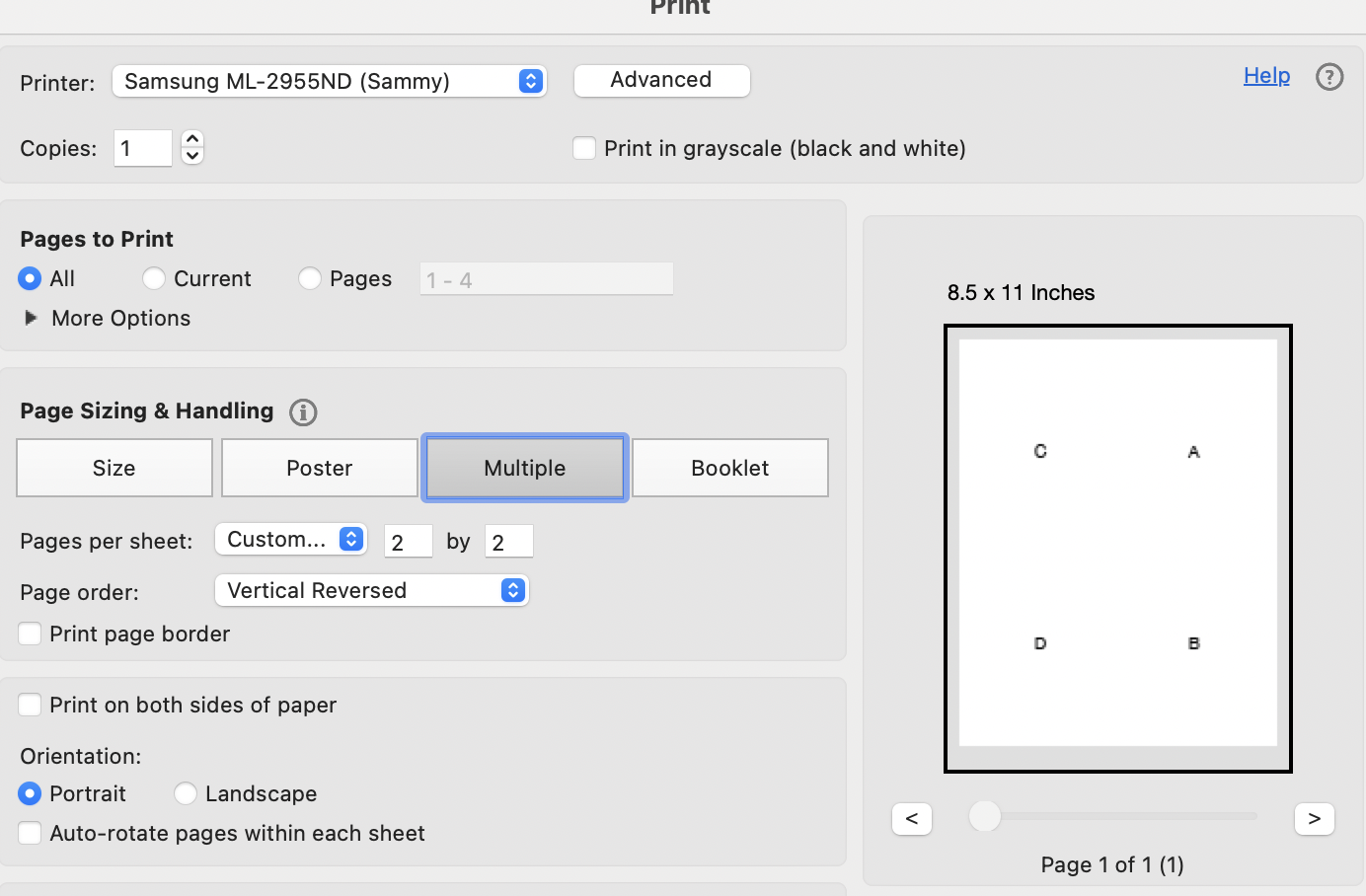 I want to do a very simple "booklet" that consists of 4 pages on a single sheet of 8.5" x 11" paper folded in half. (In other words, two pages on side A, two pages on side B. )