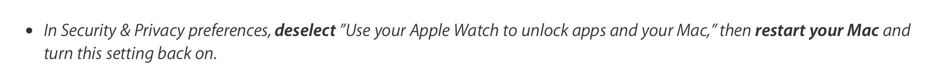 - In Security & Privacy preferences, deselect ”Use your Apple Watch to unlock apps and your Mac,” then restart your Mac and turn this setting back on.