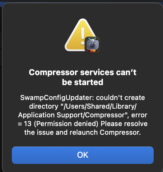 SwampConfigUpdater: couldn't create directory "/Users/Shared/Library/Application Support/Compressor", error = 13 (Permission denied) Please resolve the issue and relaunch Compressor.