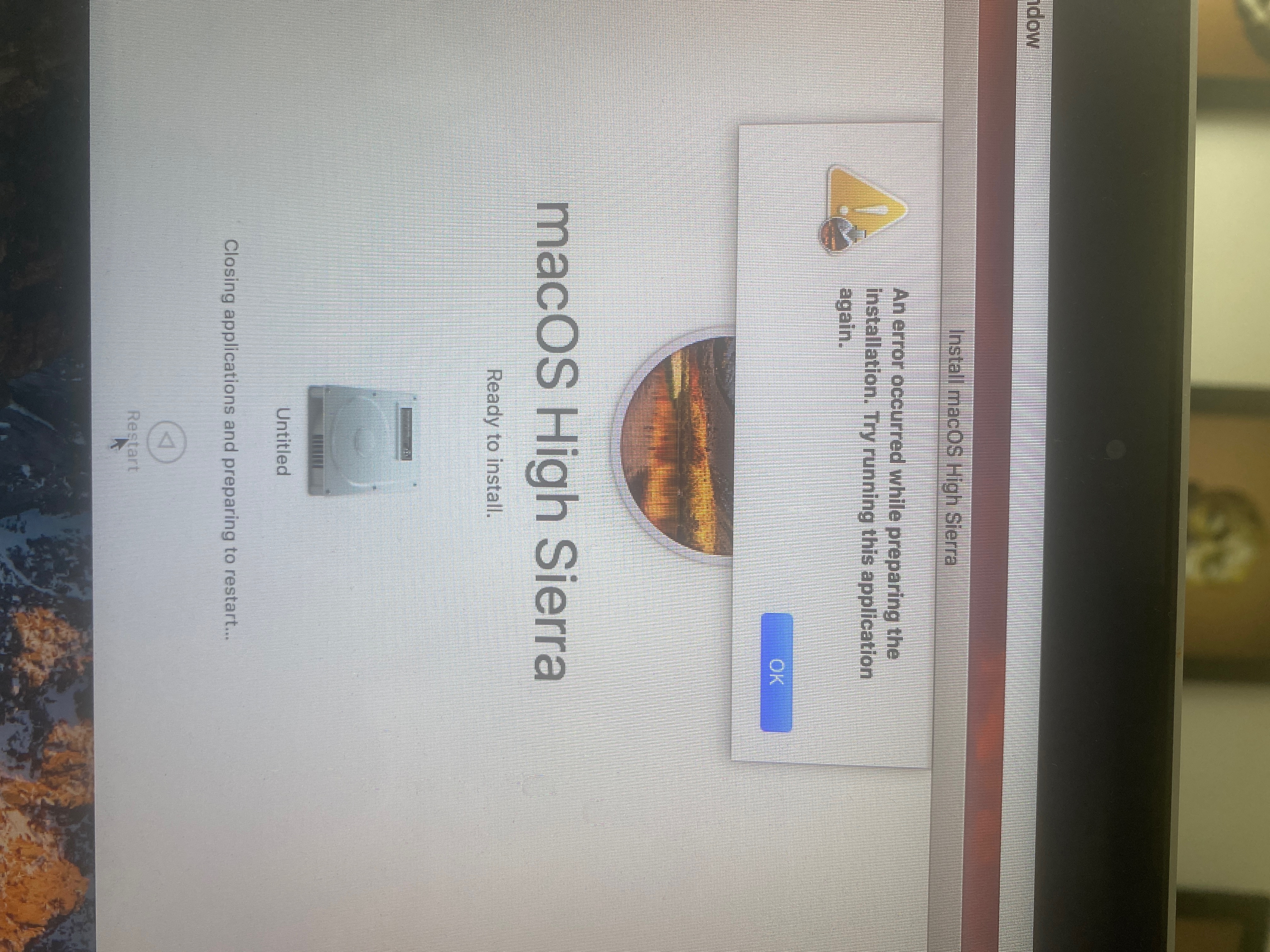 it is currently running on the sierra 10.12.6. I have been trying to upgrade it to the high sierra it installs all the way then as It restarts it fails. Is there anyone who can offer some help ?
