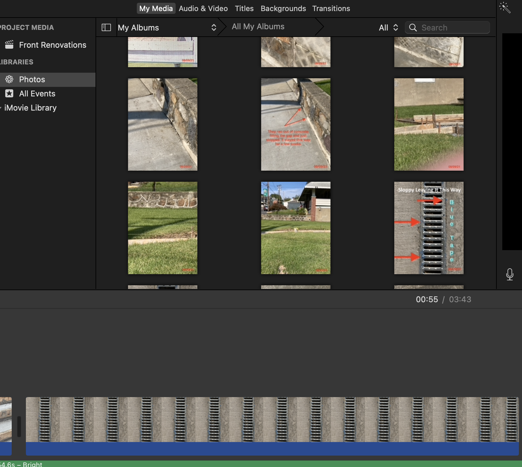 What happens if you click on the project name under Project Media in the side bar, and drag the text photo from the media browser into the timeline? What happens if you export the text photo from the Photos app to your desktop, and from there drag it into the iMovie timeline?