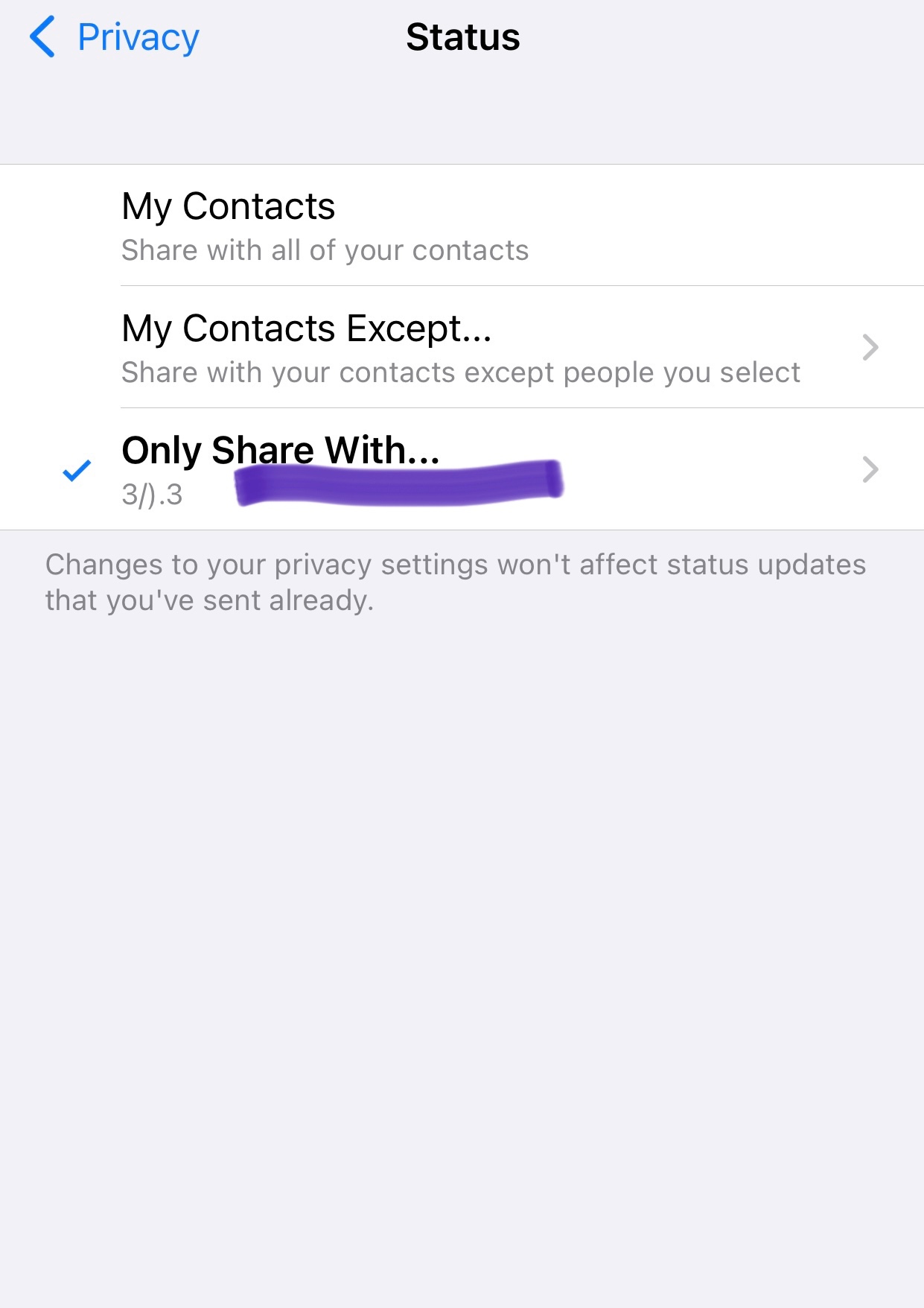 Hi, when I try settings in WhatsApp, for status privacy settings if select 7 people it must show “share only with” “7 Contacts” but for me it’s showing “3/).3”