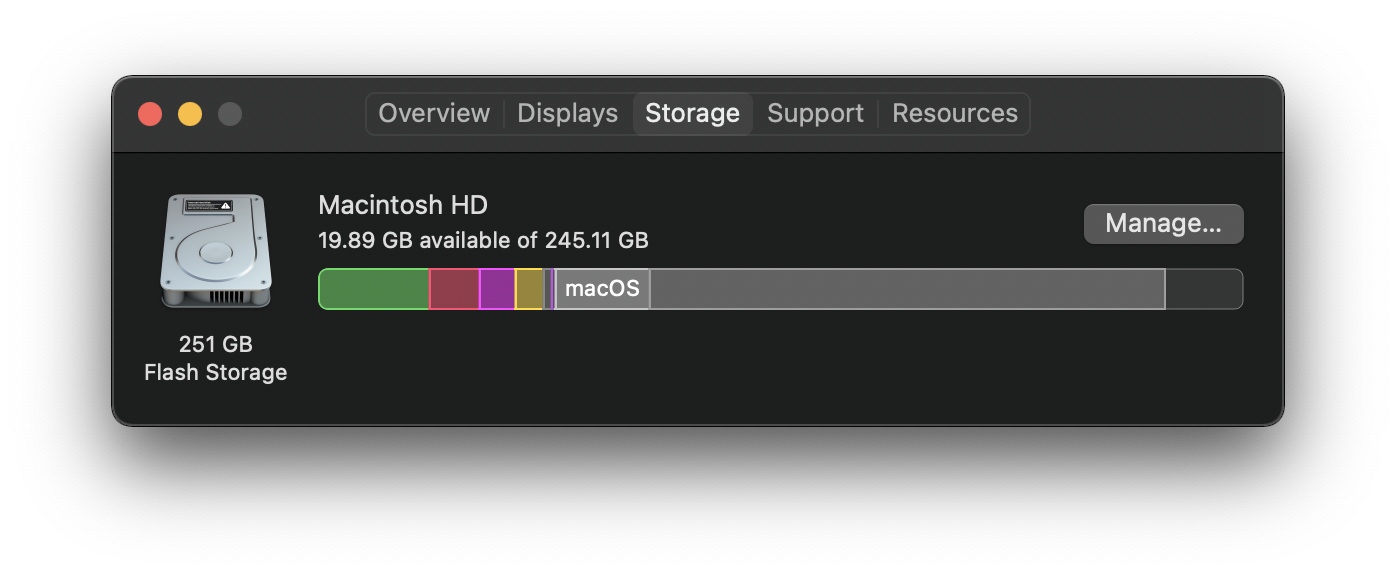 Other: Contains files that don’t fall into the categories listed here. This category primarily includes files and data used by the system, such as log files, caches, VM files, and other runtime system resources. Also included are temporary files, fonts, app support files, and plug-ins. You can't manage the contents of this category. The contents are managed by macOS, and the category varies in size depending on the current state of your Mac.