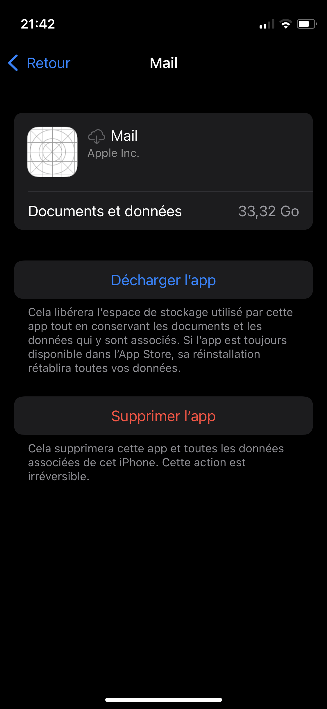 j’ai supprimé tous mes mails, tous mes spams, toute ma corbeille après j’ai essayé de décharger l’application via les réglages puis la désinstaller rien ne bouge dans les documents et données font toujours 33,32 Go