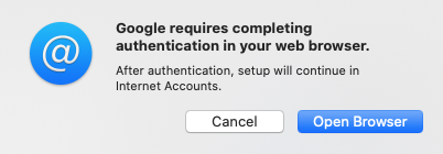 I click "open browser", Chrome opens and nothing happens. I login to Gmail in Chrome and nothing happens. I try to add the Gmail account through system preferences and the same thing happens.