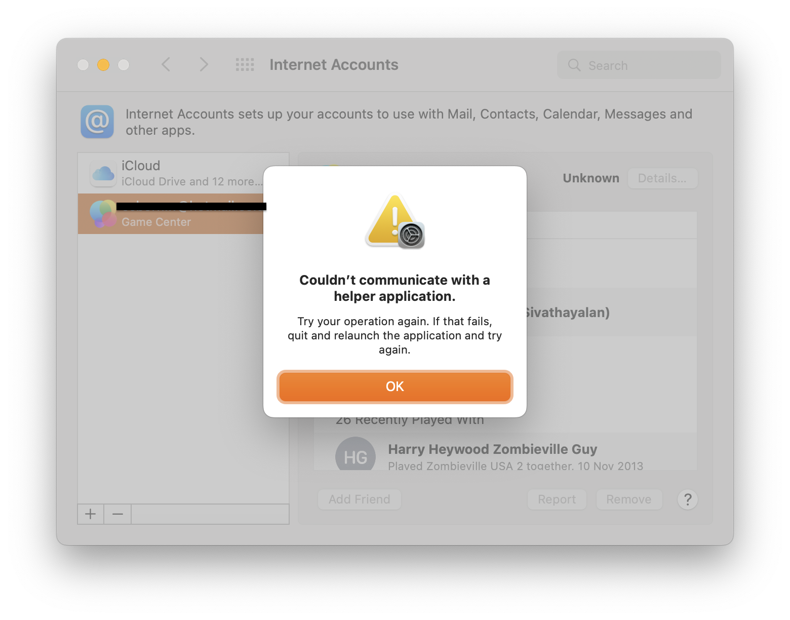 I have been playing Asphalt 8+ on Apple Arcade and want to take part in the online challenges, when clicking on any of them in the game, it tells me to "go to Settings -> Internet Accounts -> and follow the onscreen instructions", so I do that and I'm greeted with this: