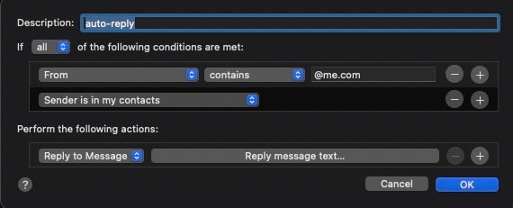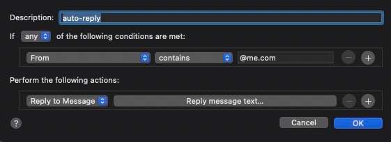Now, when an email arrives from a @me.com address, it will be automatically replied to with your Reply message at the top of the reply.