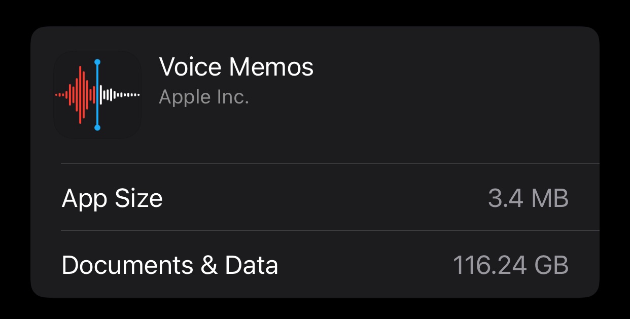 I noticed about a month ago voice memo was taking up over 100gb yet I only had about 50 recordings, I ended up deleting them for good and took iCloud off for voice memo as well. My phone is up to date and has been switched off and back on multiple times, i just don’t know what to do as it’s basically hogging up all my storage at this point.