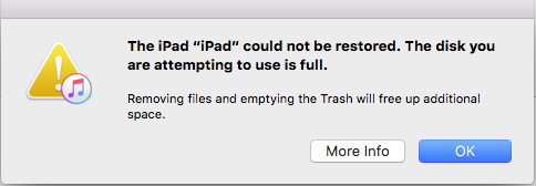 To repeat, the problem is not due to insufficient space on your iPad. The error that you see indicates that you have insufficient space on your Mac computer hard disk.
