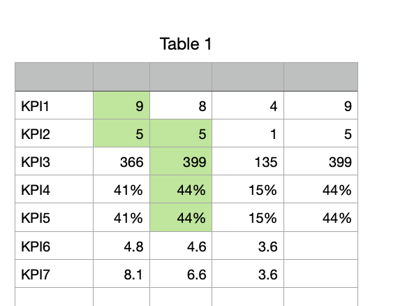 I work in sport and I've always been used to Excel. I'm looking for the easiest way to conditionally format the highest number in each row to highlight which player has the highest value of each key indicator.