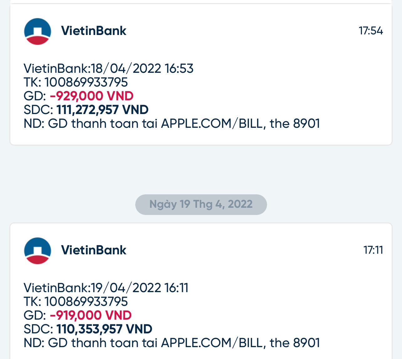 Ngày 19/4 tiếp tục trừ 919.000 cùng ứng dụng đó trong khi tôi không hề đăng ký hay bấm thao tác gì cả.