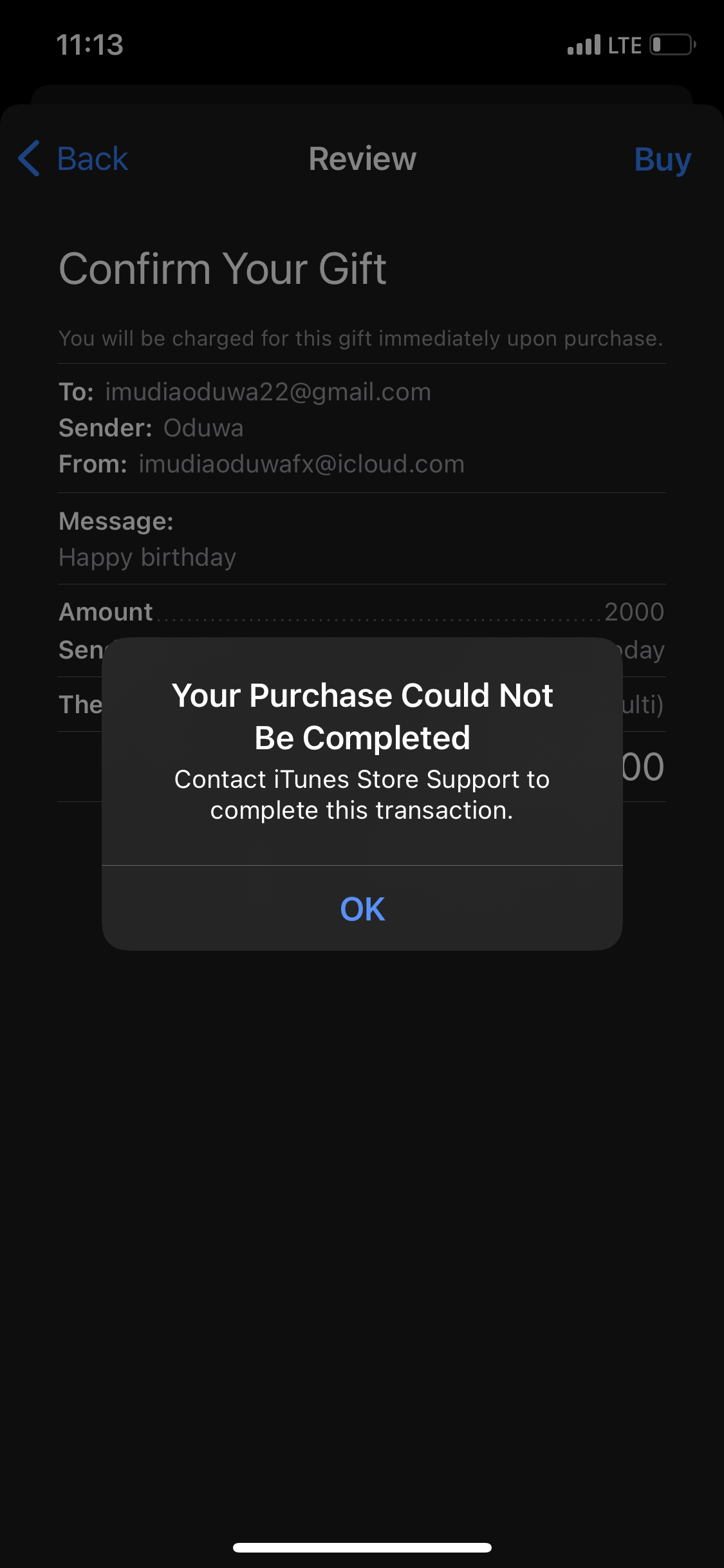 I’m trying to get a iTunes gift card by it tell me to Contact iTunes Store Support to complete this transaction