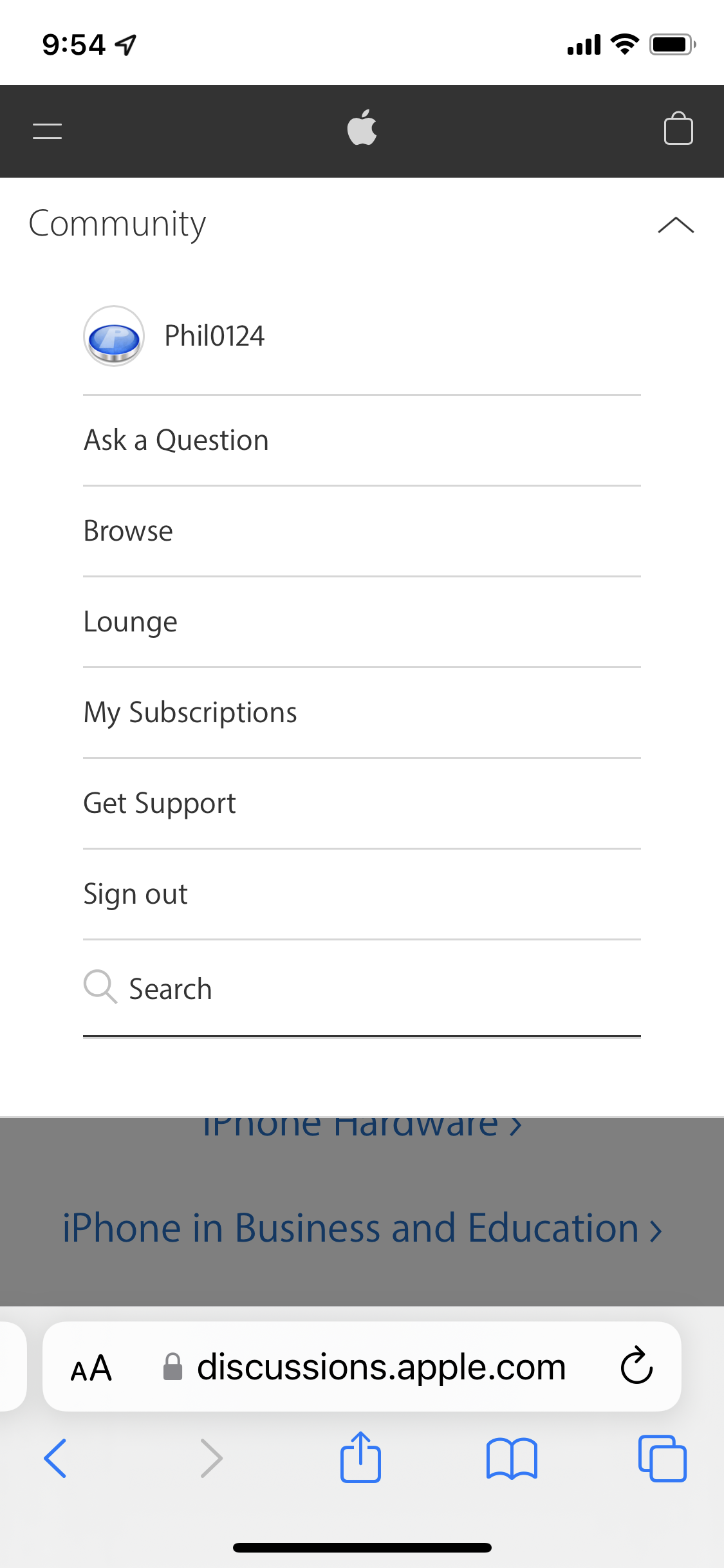 From Safari I can not see a link to My Subscriptions nor My Questions nor My Stuff. I state " my questions nor my stuff" because these are things I have read in other posts with subject revolving about links I can not see even though with the current ios version I may only be concerned with My Subscriptions, I don't know any of this stuff I read about as I can not see it on the phone.