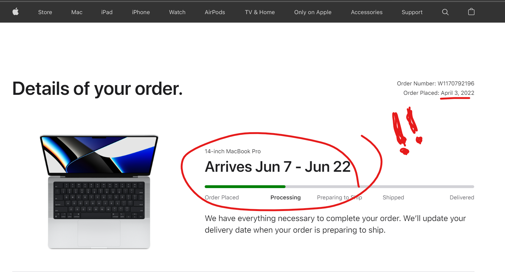 I have ordered a new 2021 14 inch MacBook pro on April 3, it is a custom order, and the arriving date was between April 25 and May 3.