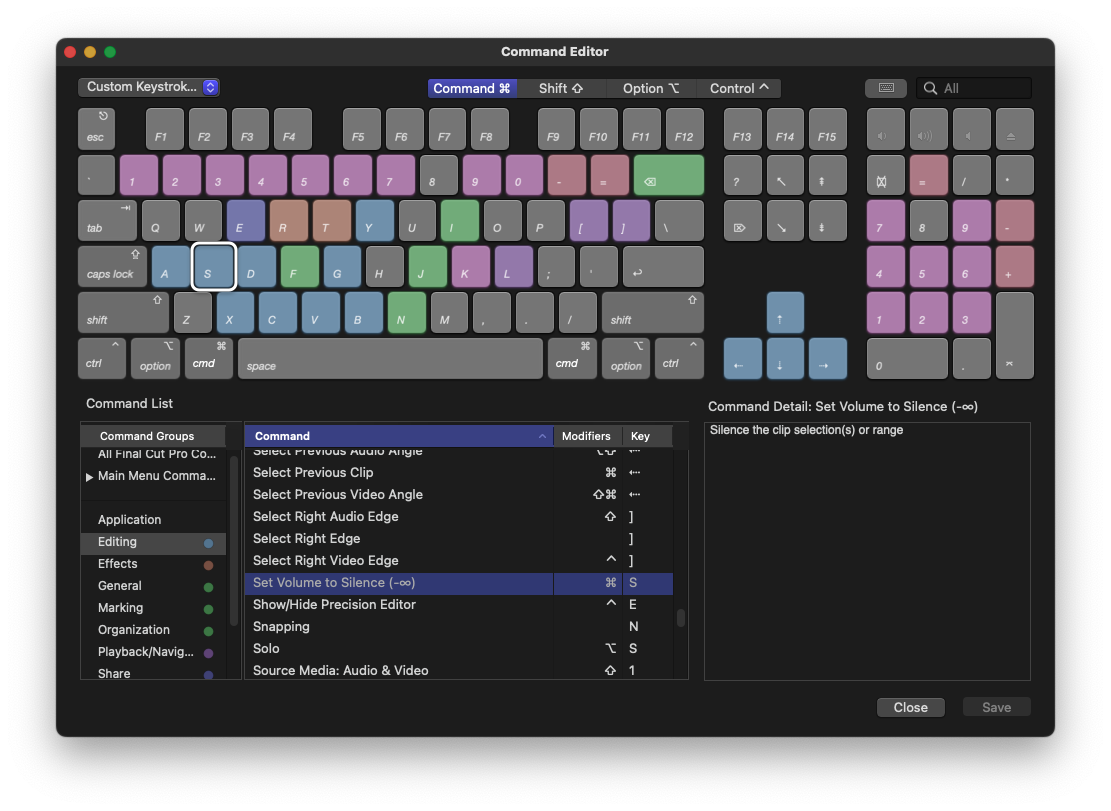 In earlier versions of FCP, I used to be able to quickly silence a clip with Cmd + S. However, it looks like that no longer works with 10.6.2. Is there another short available now to do the same thing?