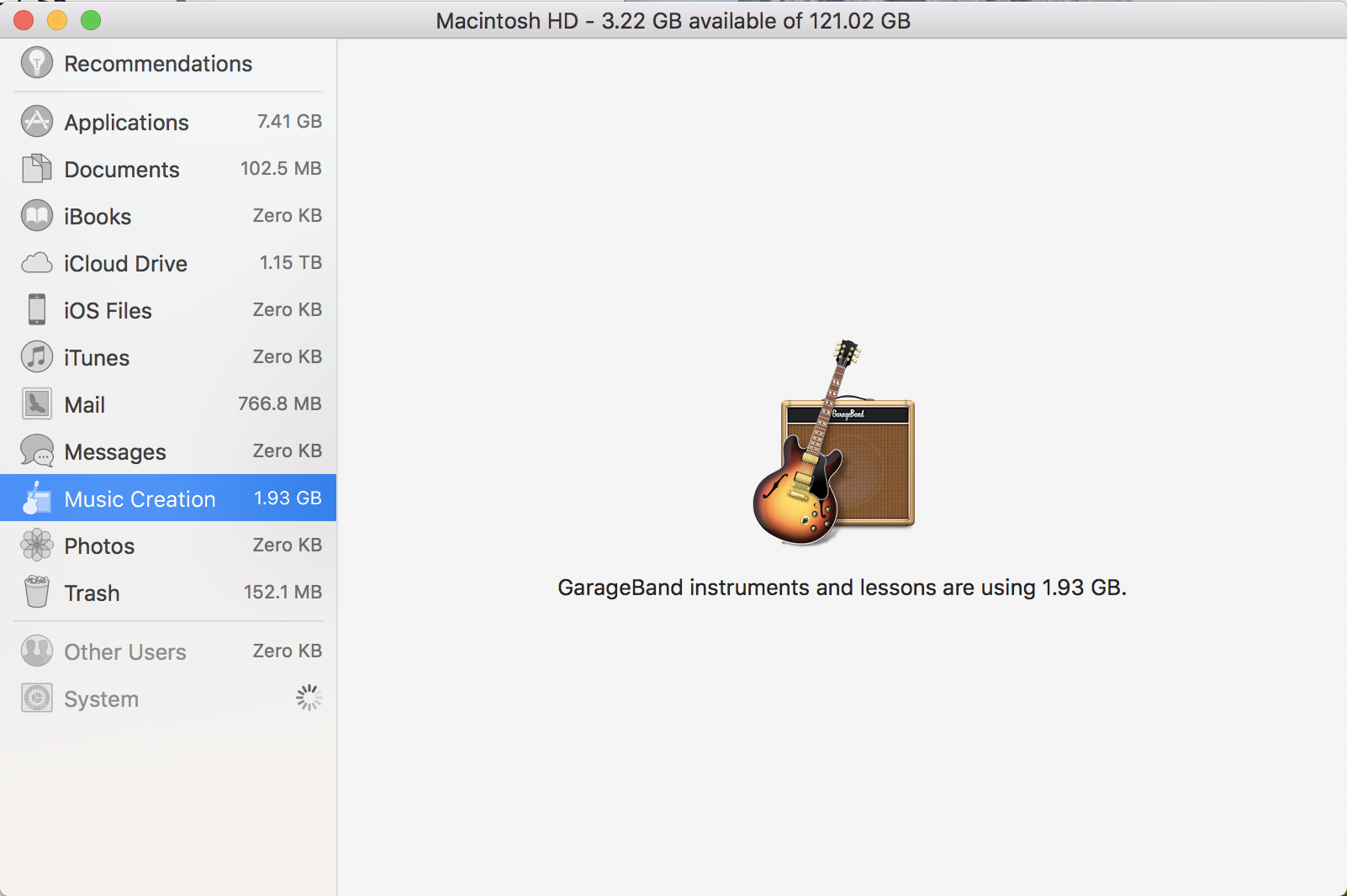 When the flag says disc nearly full, the management listing showsgarageband has nearly 2 gigs of stuff but I can't locate it. I don't have garageband on the MacBook Pro because of lack of space.