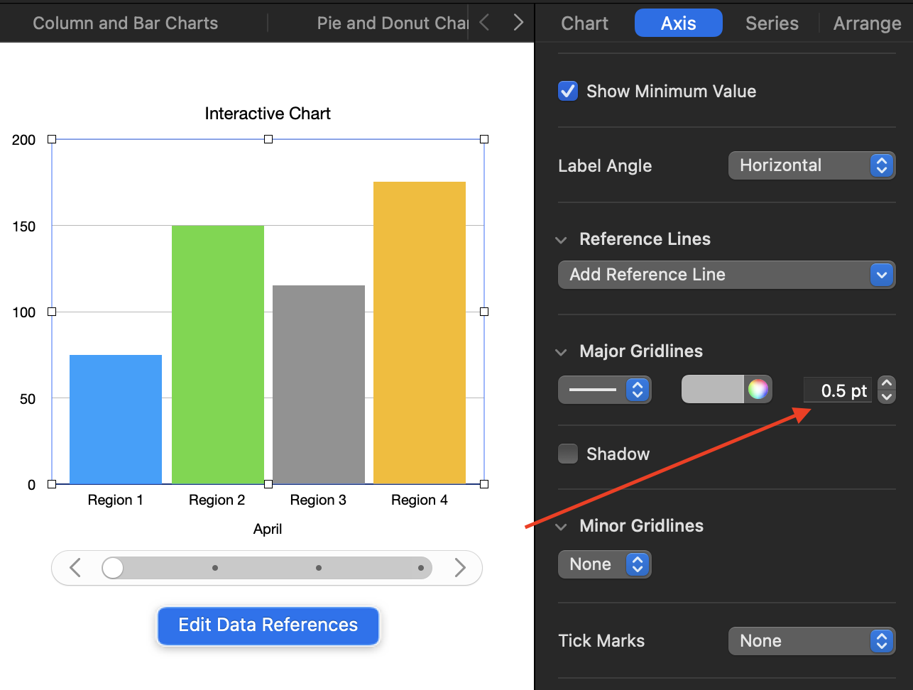 In the sidebar (click the Format icon to display it), click Axis and select the size (the last box on the right, by default 1 pt) in Major Gridlines.