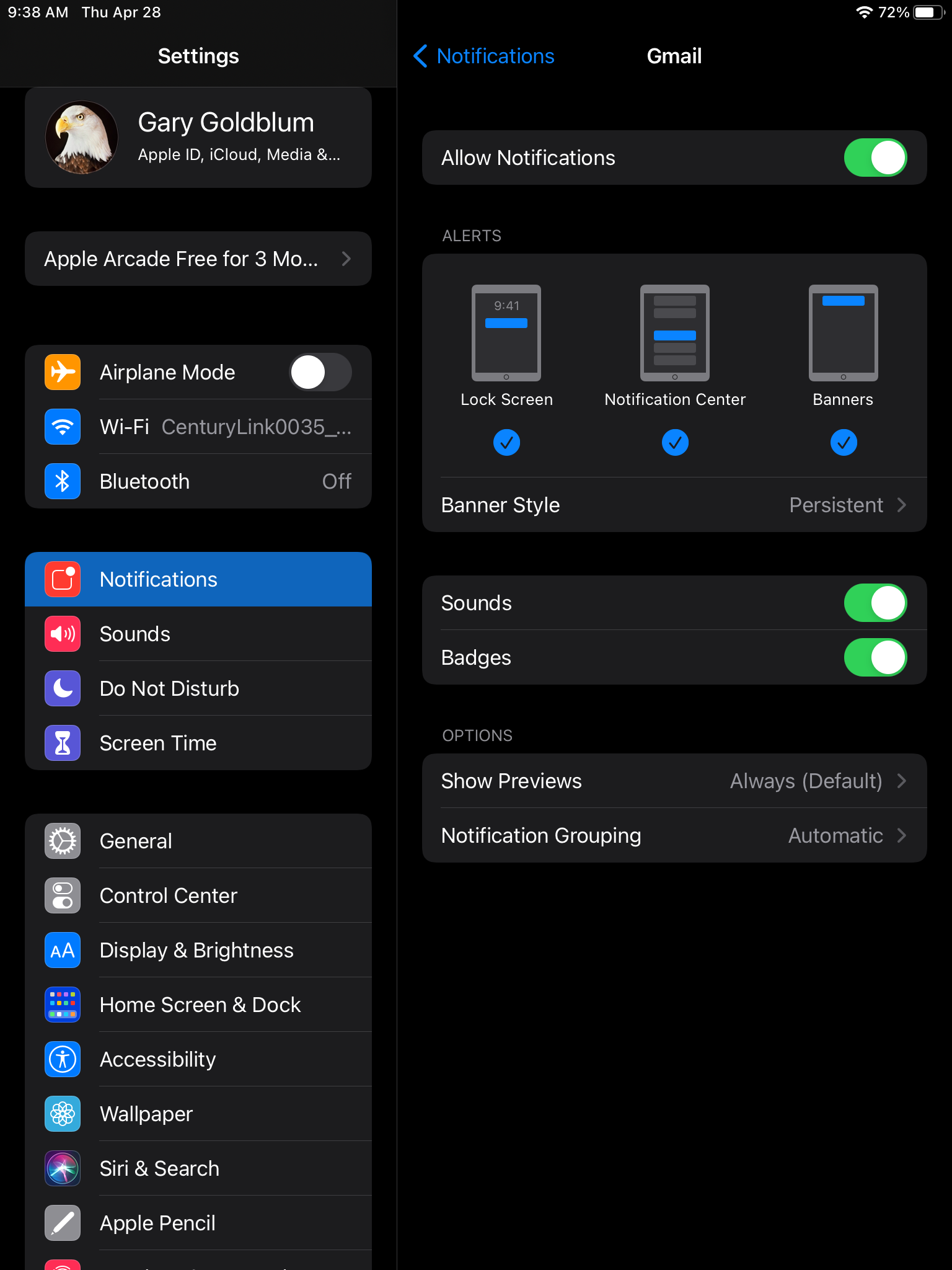 With the Banner Style set to Persistent, as illustrated, the screen notification should remain visible on your unlocked iPad screen until dismissed.
