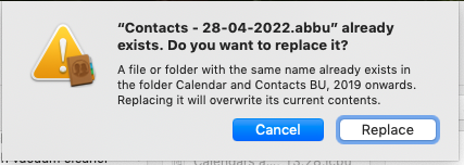 I found these instructions online. in an Apple document: 'File/Export/Contacts Archive/Choose a location/Save', but when I did this, the attached warning appeared. As I wanted to archive Contacts, but also retain the current Contacts for everyday use, I played safe by clicking 'Cancel'. Which has got me nowhere. Any help or advice would be much appreciated.: