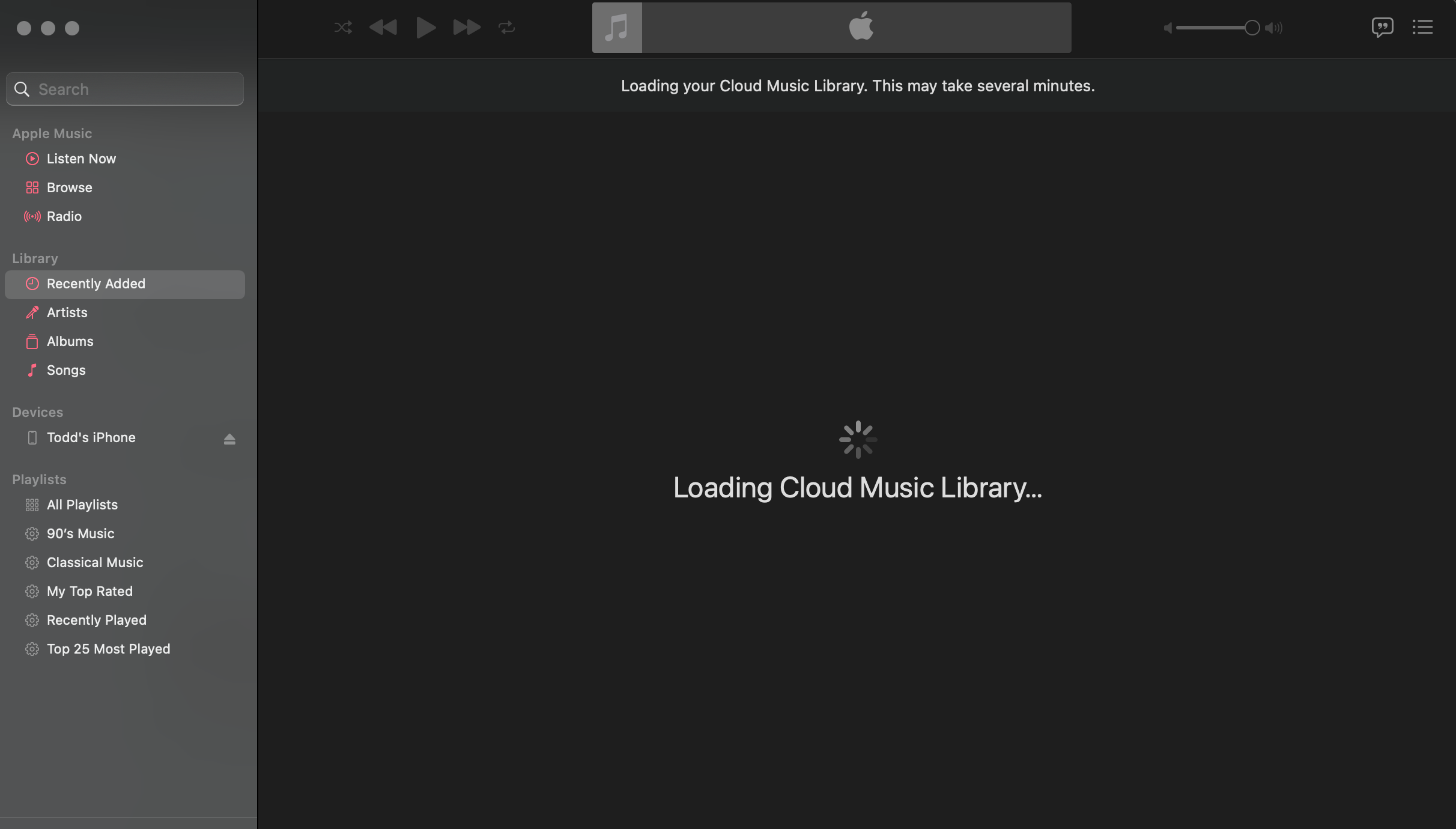 "Loading iCloud Music Library" takes forever, then times out with "An Error Occurred"