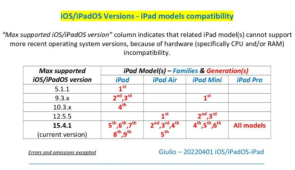 Here is a list of the highest version of iOS supported by the older models of iPad (for simplicity - “generations” are shortened to a number) that are restricted in their ability to be updated: