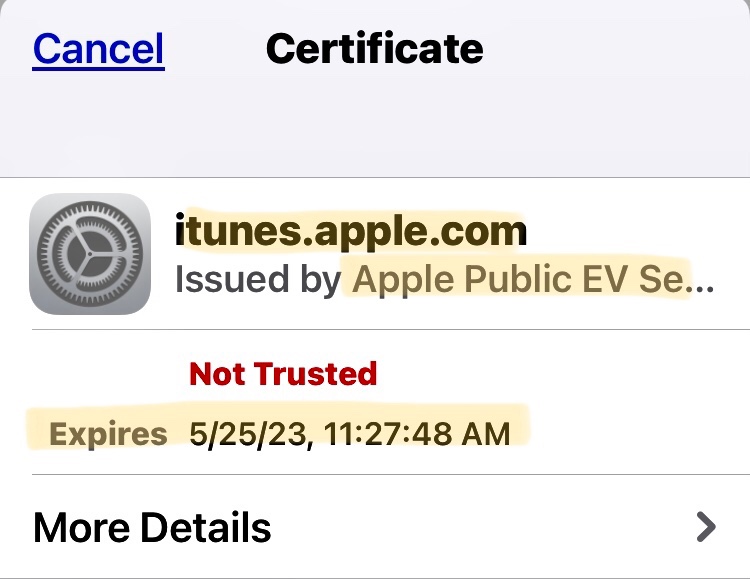 My iPhone 8 is using ios 15.4.1 (19E258). Why am I getting a notification that the certificate for (itunes.apple.com) issued by Apple Public EV, “IS NOT TRUSTED”.