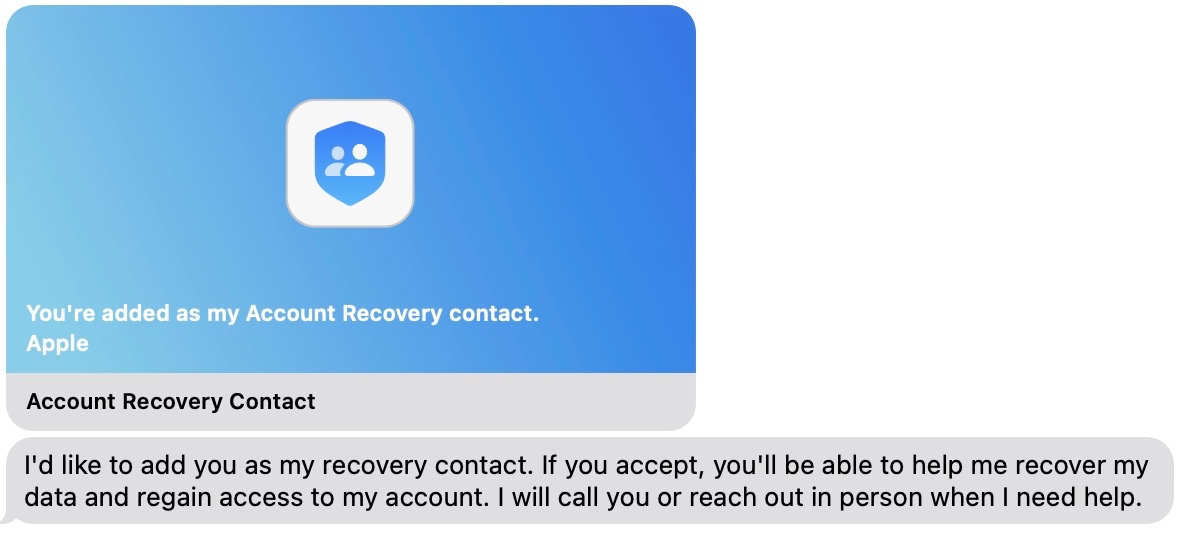 The other person will receive a text message with two parts: One blue background area with the text "You're added as my Account Recovery contact. Apple." Underneath that is the text that was suggested (or edited by you), starting with "I'd like to add you as my recovery contact. If you accept, you'll be able...". Here's a screen shot: