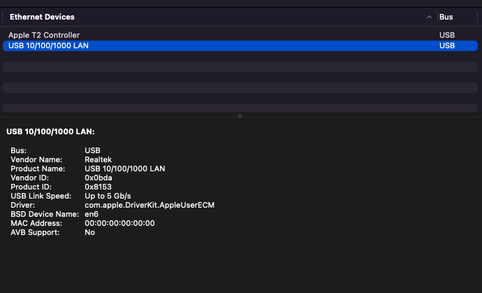 I am using a USB-C adapter which has a LAN port. It is a Realtek 8153 adapter model, and I have attached a screenshot of its detail from the System Report.