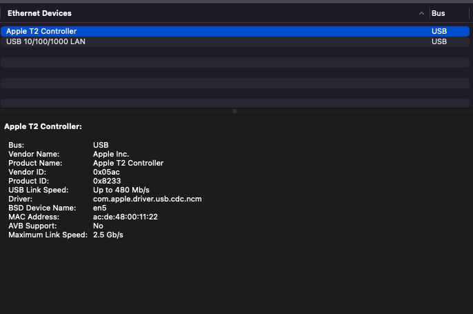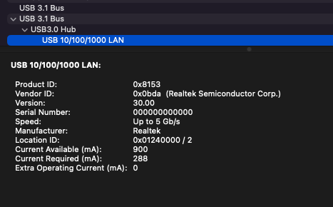I am using a USB-C adapter which has a LAN port. It is a Realtek 8153 adapter model, and I have attached a screenshot of its detail from the System Report.