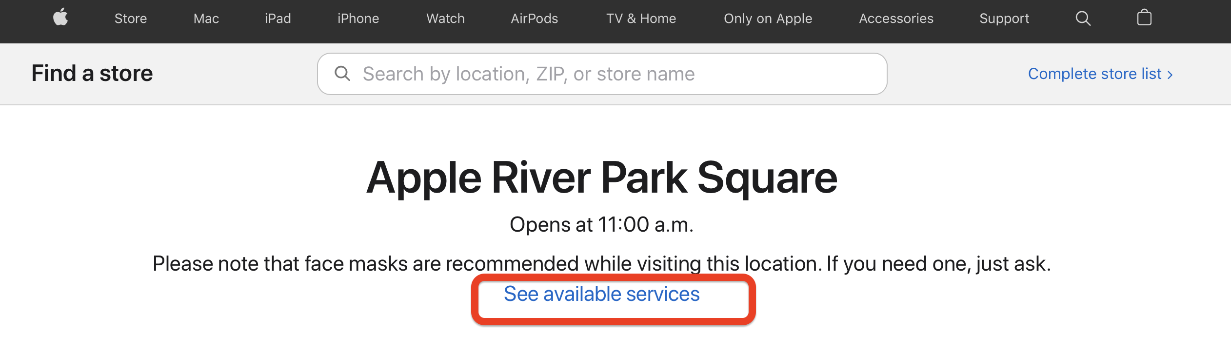 Click the Apple Store box and enter your location or the location of the store you wish to visit. When you find the store site, click "See available services: