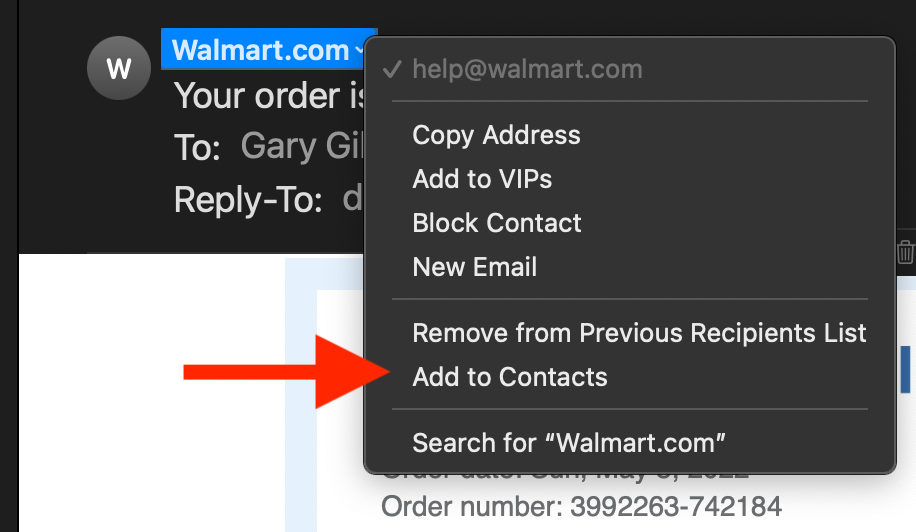 You can add a contact in the email app. Just click on caret after Mailer's name to get menu.