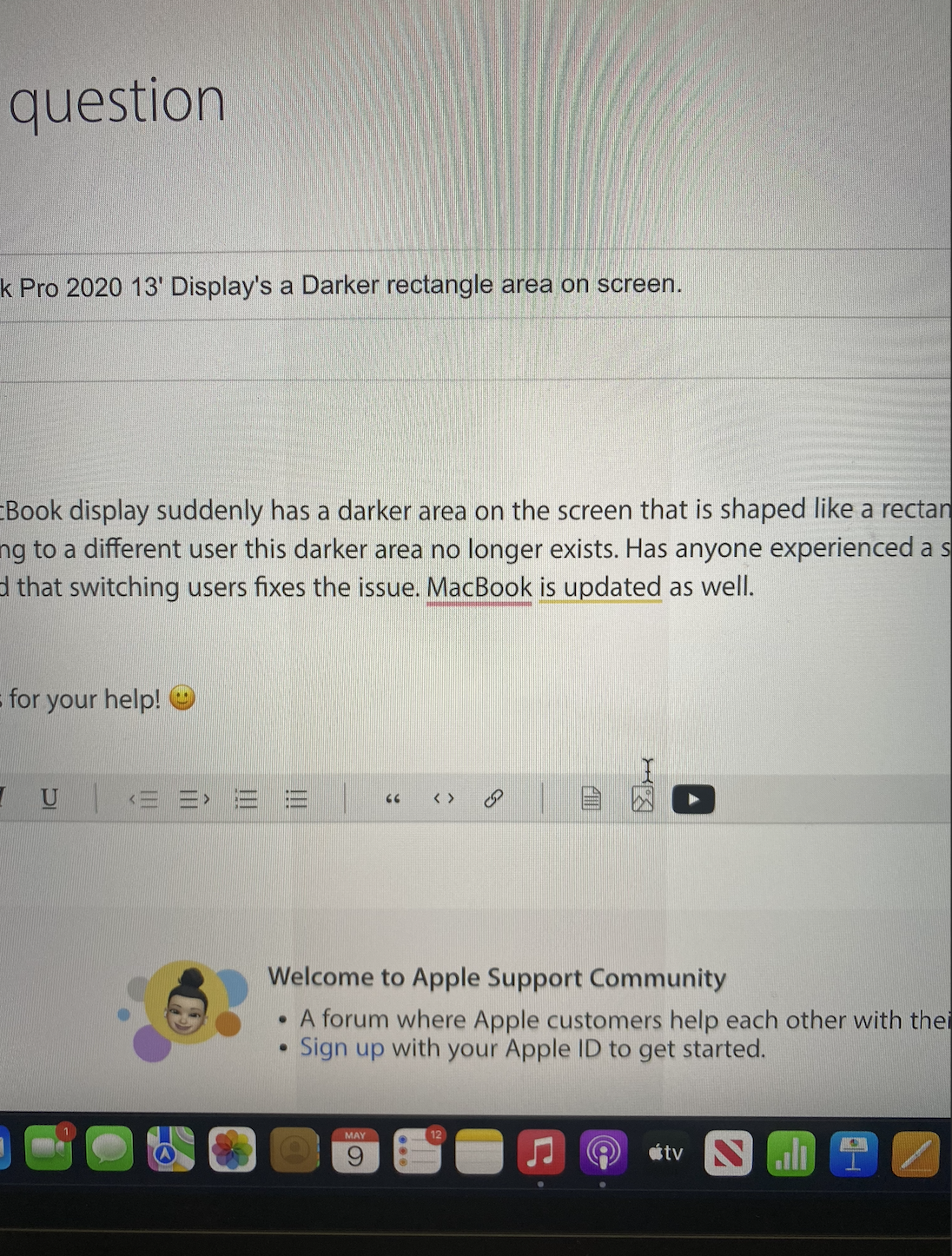 My MacBook display suddenly has a darker area on the screen that is shaped like a rectangle. But when switching to a different user this darker area no longer exists. Has anyone experienced a similar problem? It is odd that switching users fixes the issue. MacBook is updated as well.