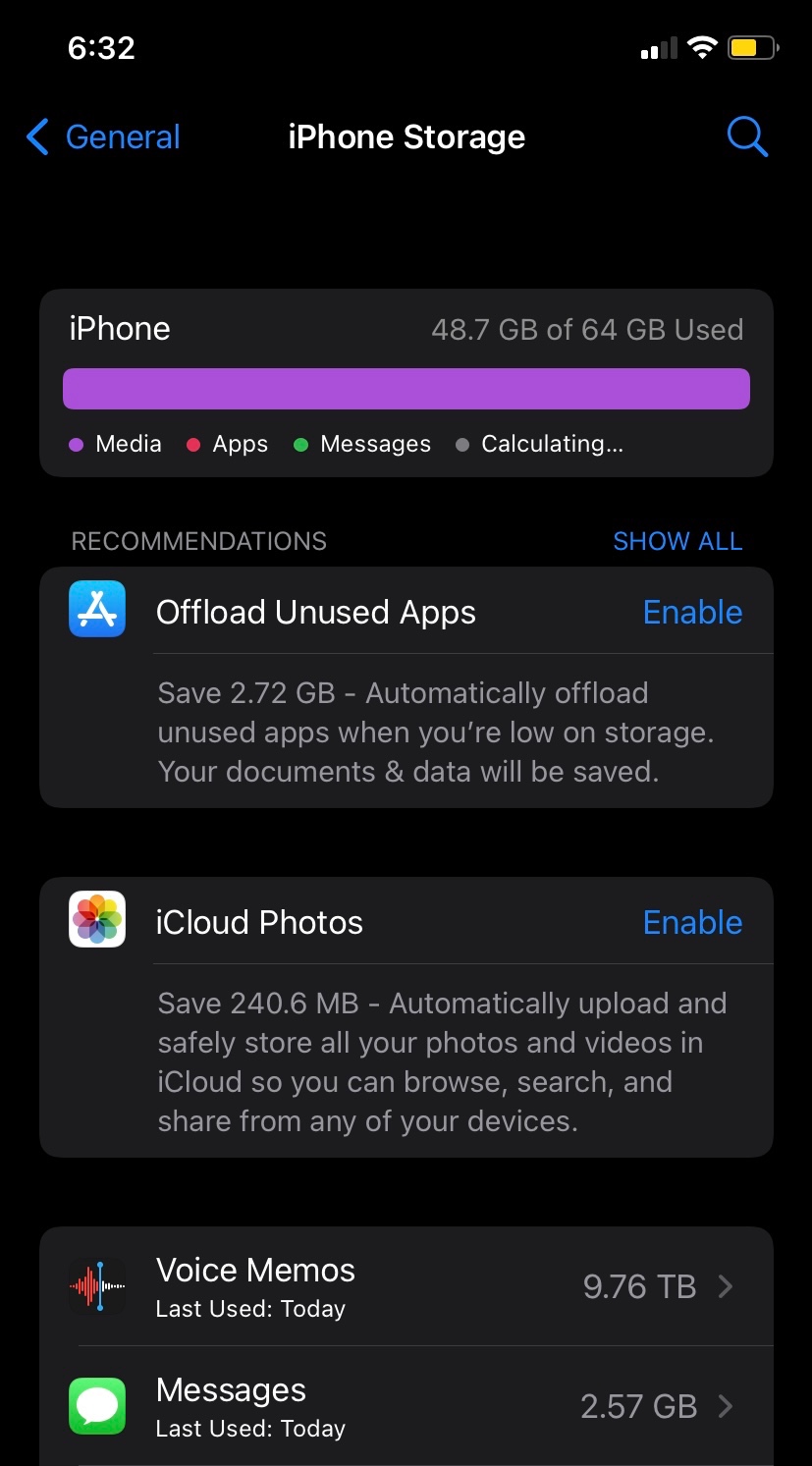 also on my main page for iPhone states I’m using 48.7 GB out of 64 GB. Just trying to reduce it with no luck.