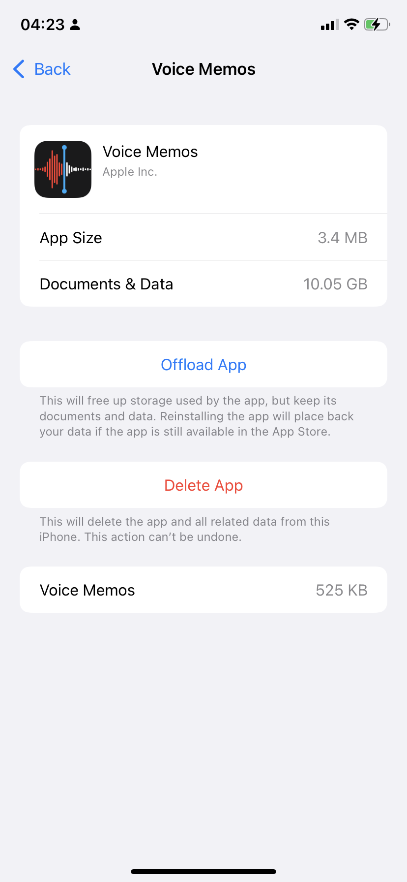 It says i have 9.76 TB of documents & data for voice memos. I’m having no luck getting this deleted.
