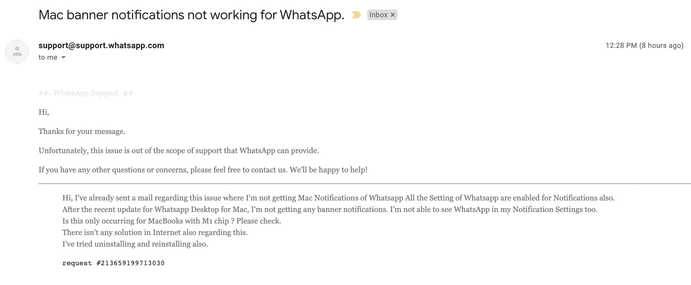 When using whatsapp I don't get notifications. I enabled notifications in the app settings.