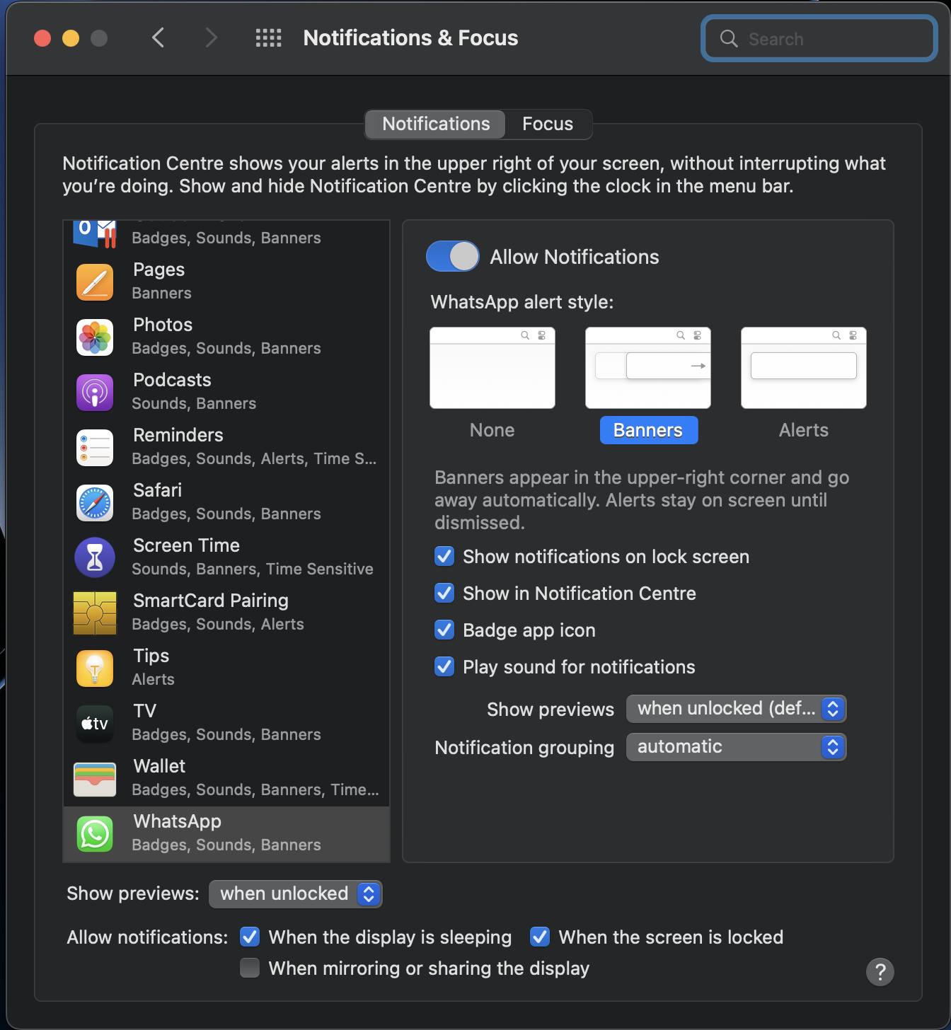 In macbook system preferences -> notifications&focus whatsapp is not even amongst the apps which is weird because I figured it should be.
