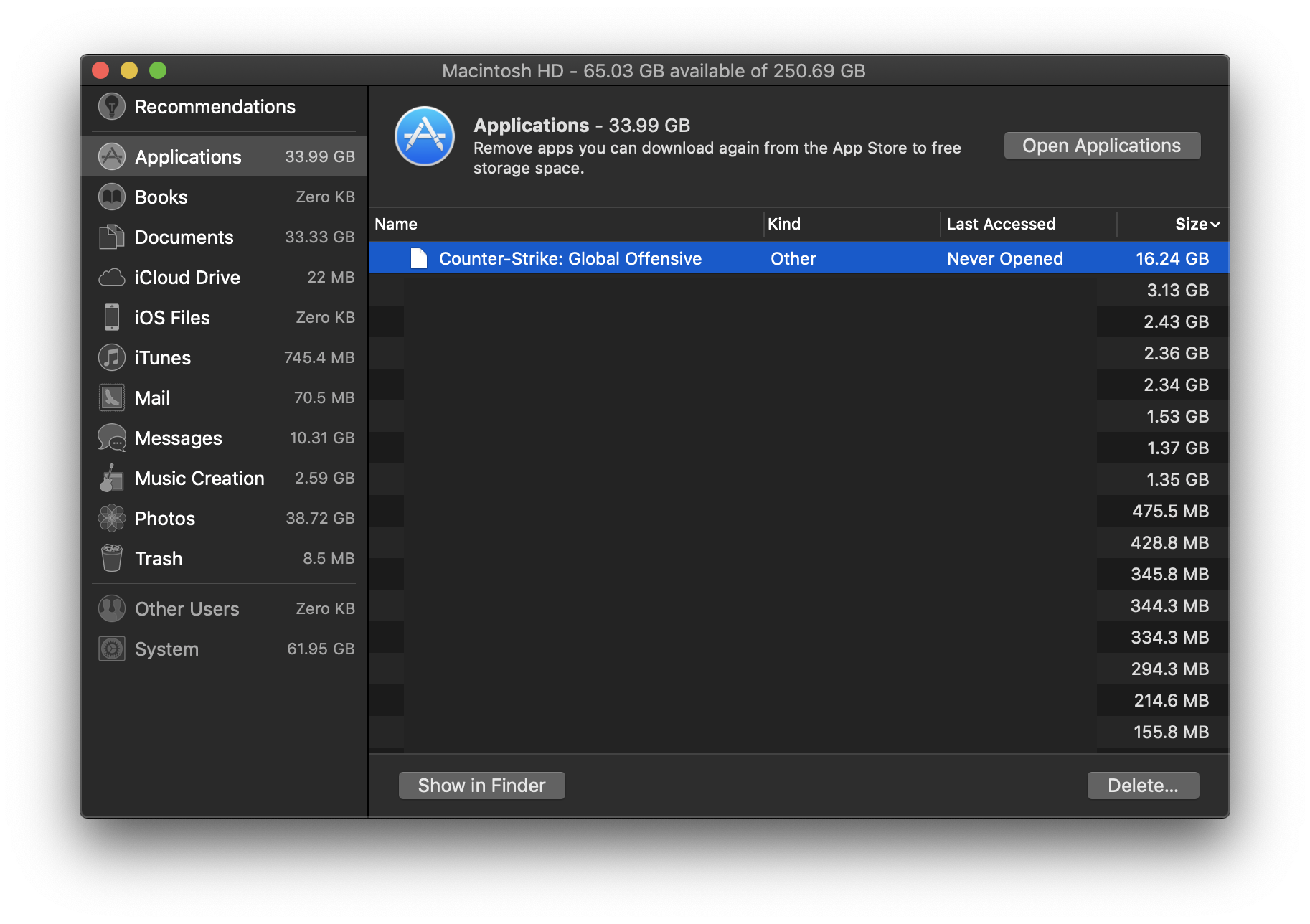 clearing up space at system insistence and found this file - Counter-Strike: Global Offensive - never opened kind is other and its 18.35 GB's - show in finder reveals nothing - search in finder and applications reveals nothing - the deletion window of MacBook Pro using Mojave does nothing - any ideas how I might get rid of this annoyance to regain that space?