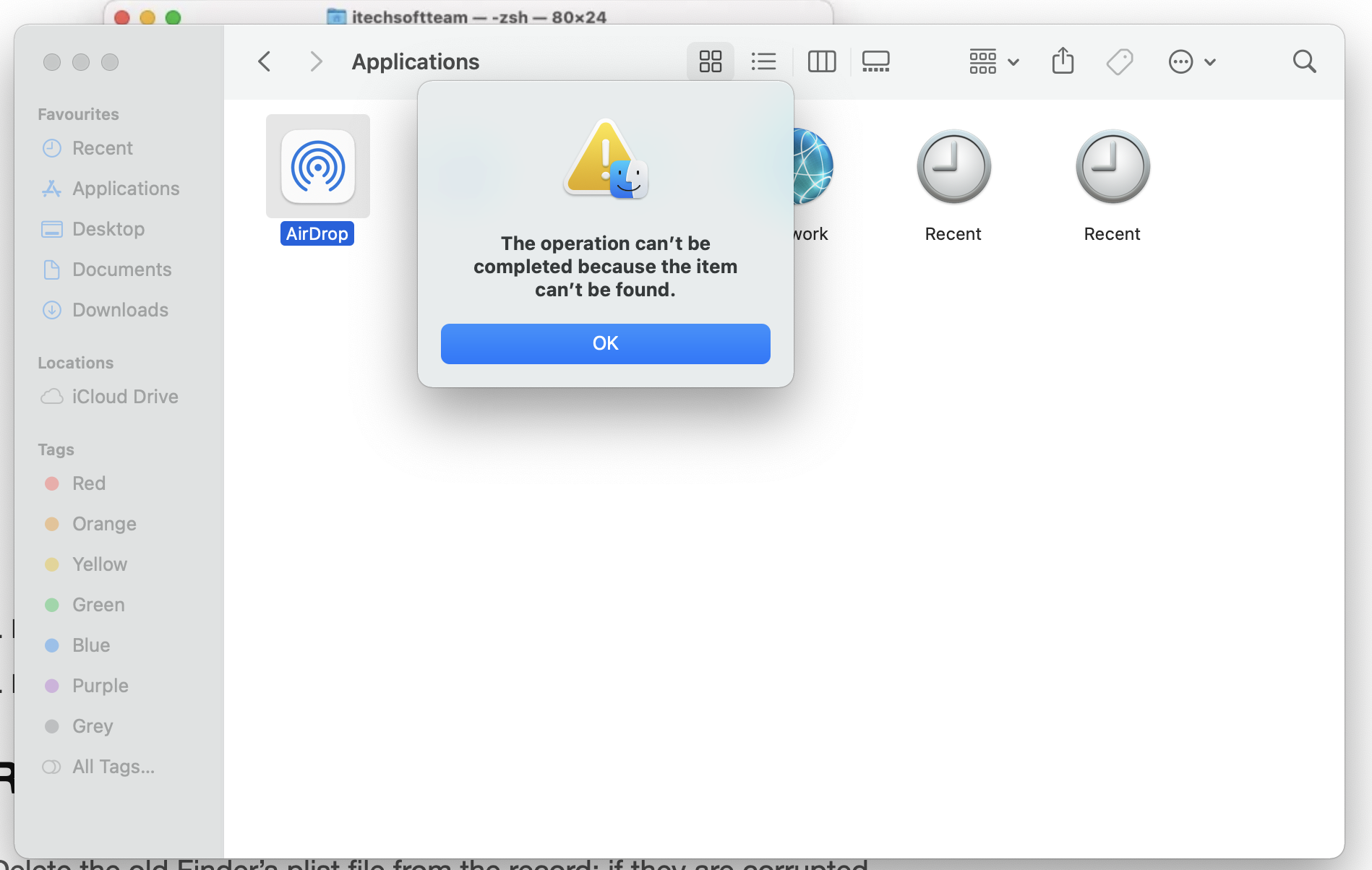 I've also done some troubleshooting online, and when I try to open Airdrop manually from Applications, it simply says application not found. (screenshot 2)
