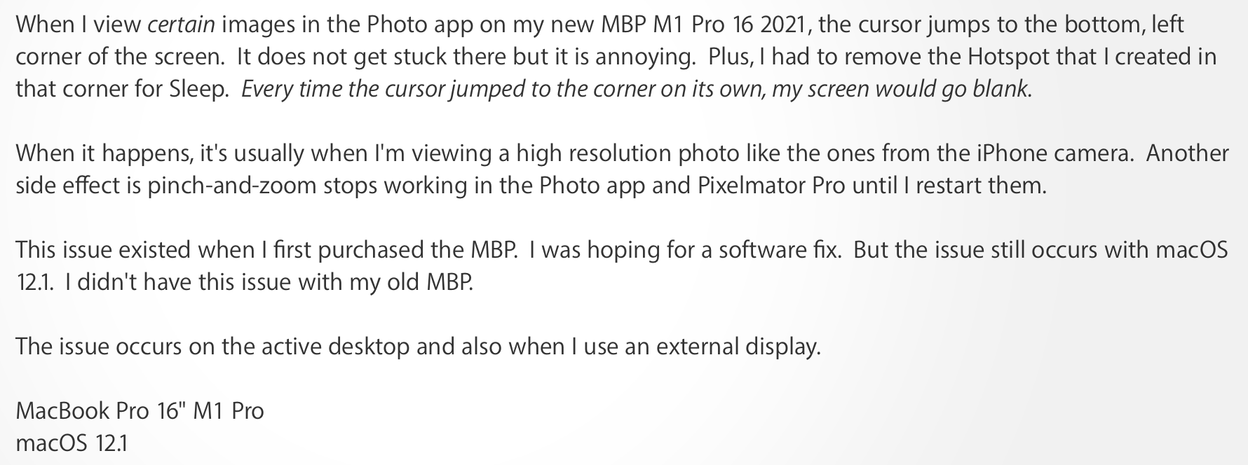 • A few minutes ago, I opened the same image and the cursor did not jump to the corner. In fact, the cursor did not jump when I opened Photos like it was constantly doing this morning.