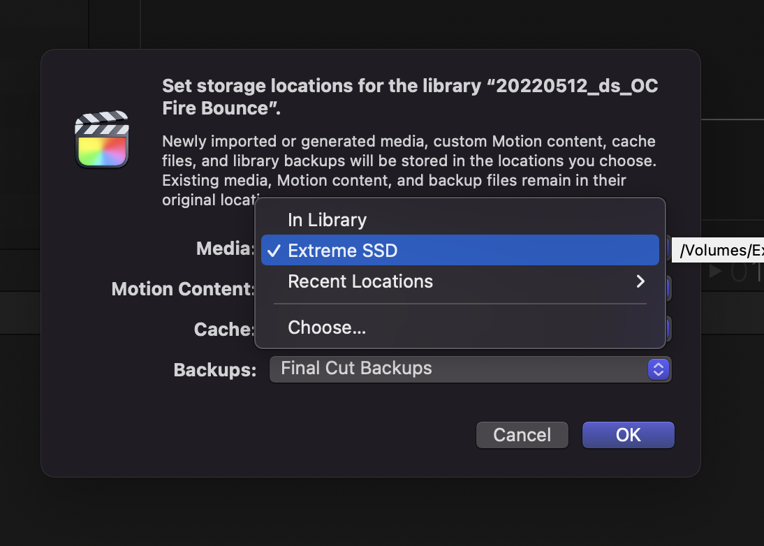 When editing out in the field on a new external SSD, when I went to create my libraries, I forgot to set the storage location(s) to "In Library." So, FCP defaulted to storing the media in separate folders on the SSD, "outside" of the Library. (See: screen shots--media were put in separate folders on drive named "Extreme SSD.")