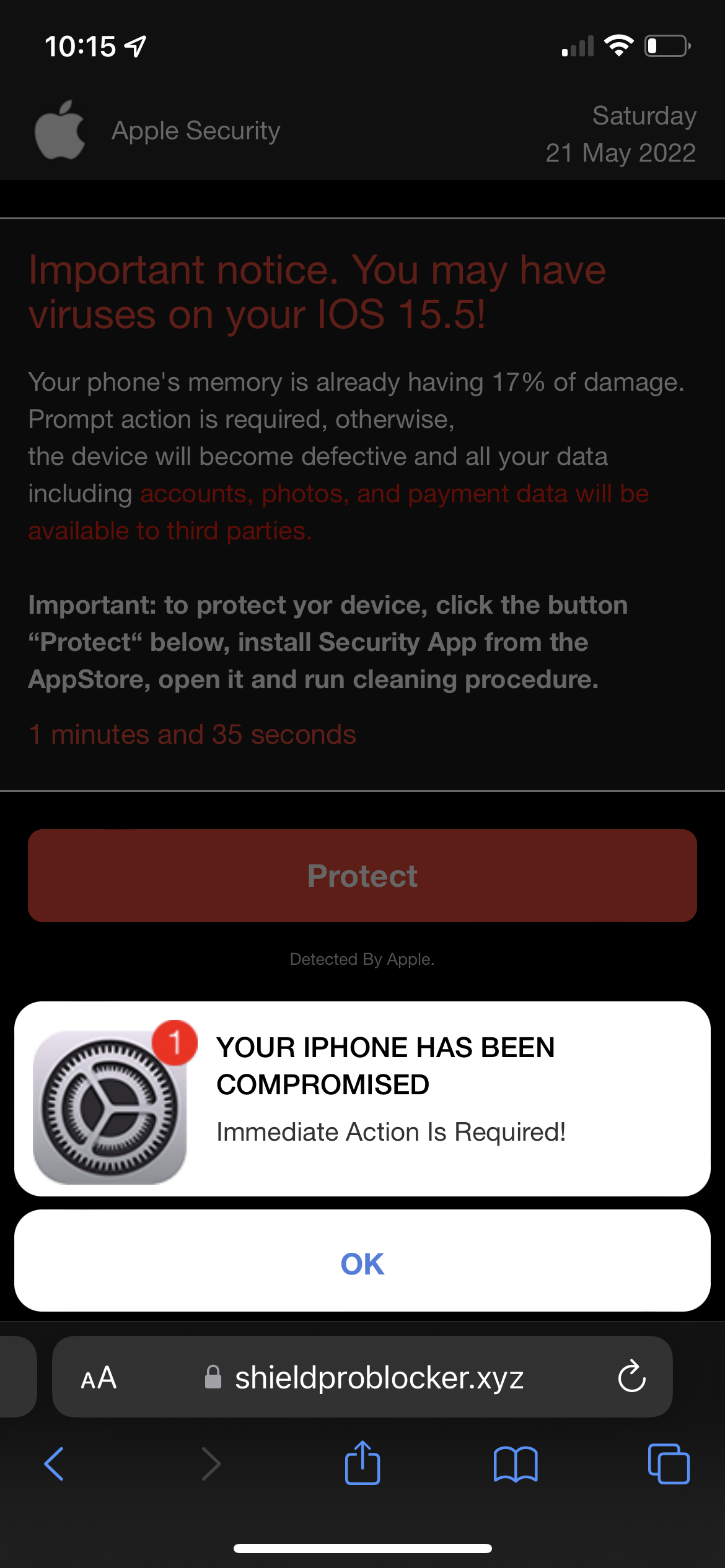 Hello Apple i Was on Safari and out of nowhere this virus message pops up is this a scam? I could tell for a fact this scam
