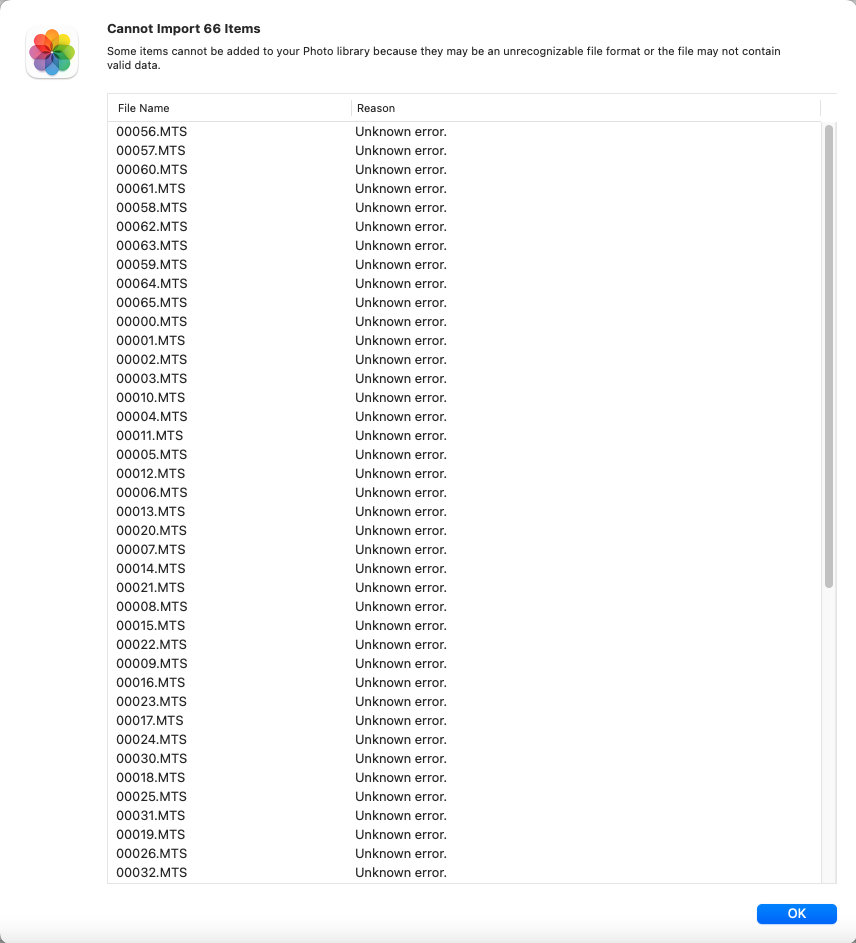In case I can help others with this issues, I'm reposting the "AVCHD (.MTS) file import into macOS Photos" thread from a couple of years ago. After struggling with this for several hours in order to import archived folders containing Sony AVCHD files (spanning several years and all 10+ years ago) into Photos footage from a restored hard drive, I found the following thread, which quickly resolved my issues: