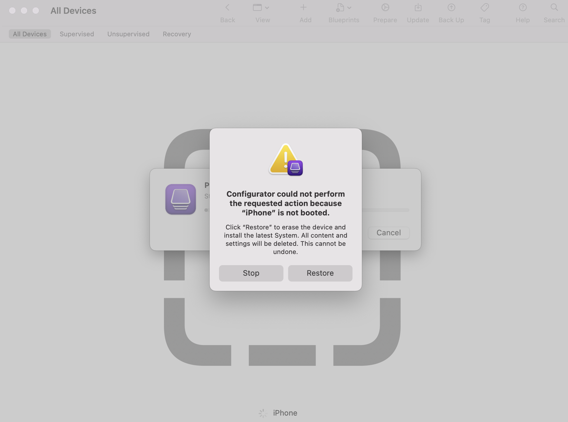 Configurator could not perform the requested action because "iPhone" is not booted.