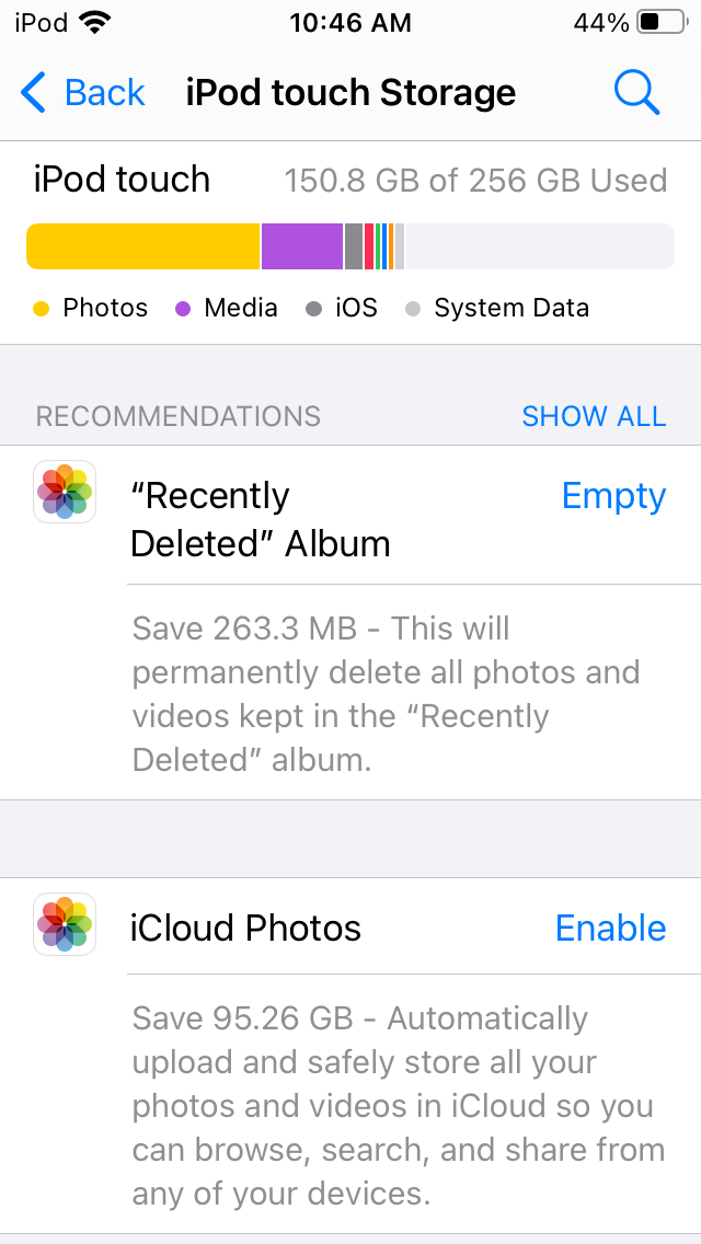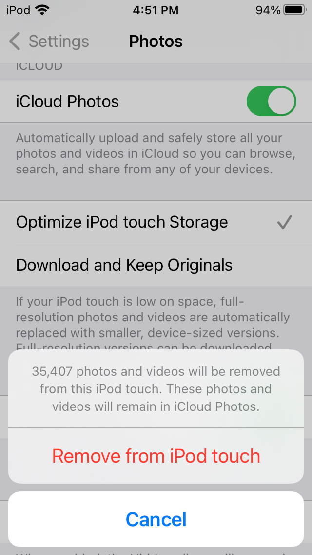 I got a new iPod last week. I want it to be able to view my iCloud Photo Library and upload new photos I take with said iPod. However it seems iCloud has downloaded my entire iCloud library to my iPod. I have no idea how or why. To my knowledge that’s not even an option. My iPhone and iPad haven’t experienced this. This has also been draining my battery like crazy. It was 99% when I got up two hours ago and it’s now 35%. What do I do about this?