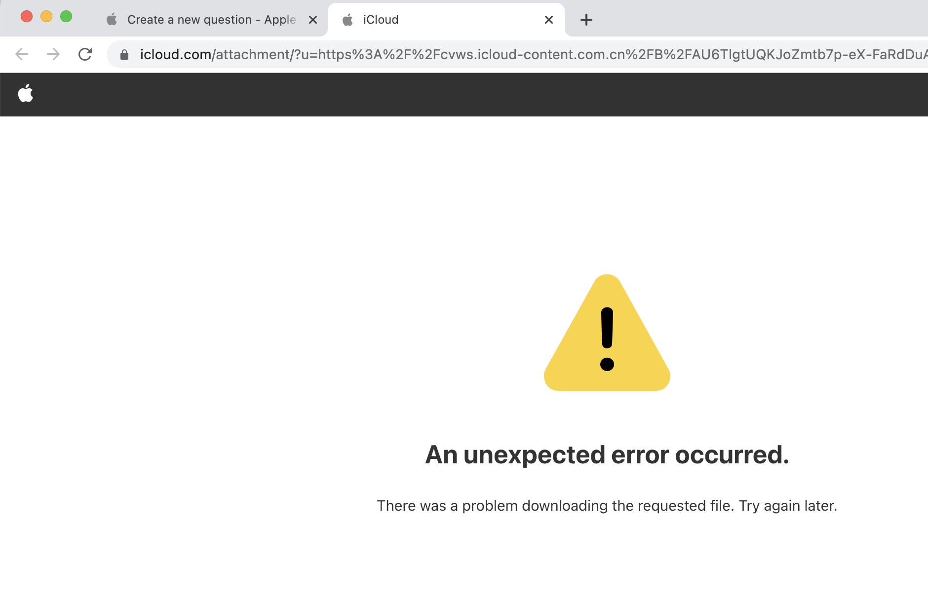"Unable to download files from iCloud link?: The screen pop-up this error message after clicking the link in APPLE mail (download from iCloud). Any help on this?"